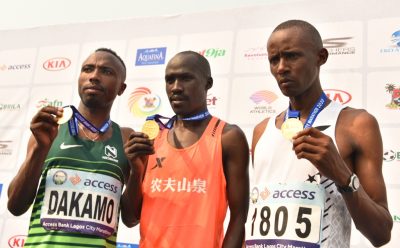 Winners of the Male category, 2nd Prize – Debeko Dakamo from Ethopia; 1st Prize – David Bamasai Tumo from Kenya and the 3rd Prize – Paul Waweru Chege from Kenya during the Lagos City Marathon, at Eko Atlantic City, Victoria Island, on Saturday, February 8, 2020.