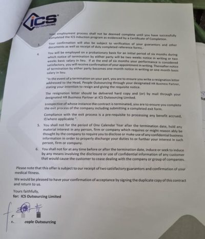 According to the contract, termination would occur for probationary staff only after the company had issued them a two-week notice or two weeks’ worth of salary. For confirmed staff, it was one month.
