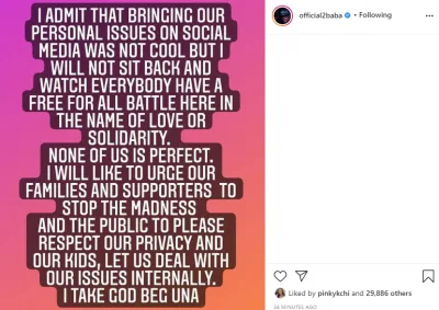 2Baba in reacting stated that though bringing their personal issues to social media was not cool, he will however not sit back and watch everybody have a free for all battle in the name of love or solidarity.