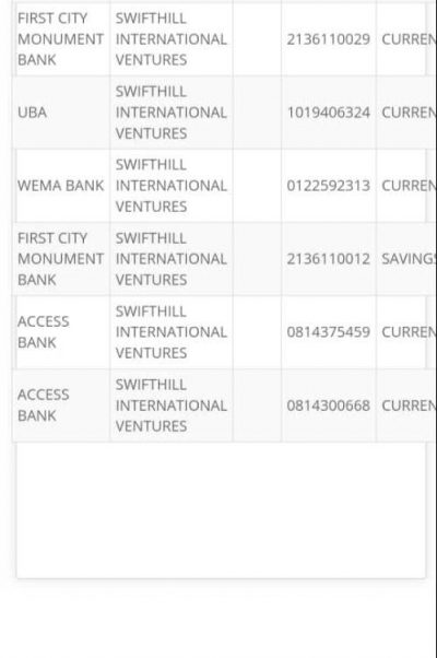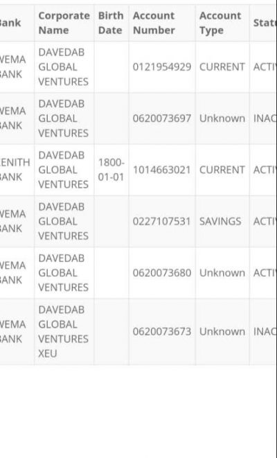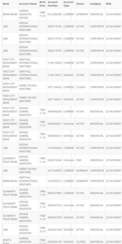 Some of the companies linked to the BVN include Adesav International Ventures, Fabric Splash Ventures, Swifthill international Ventures and Quick Solution International. Others are Quick solution International Ventures, White Honey Enterprises, Cream on Ice Services, A.B DELCO Nigeria Company, and Fabric Splash Ventures, Skye-Macosh Company, Swifthill International Ventures, Silver Section Global, Davedab Global Ventures and Jose-Macosh Company and De Kingrun.