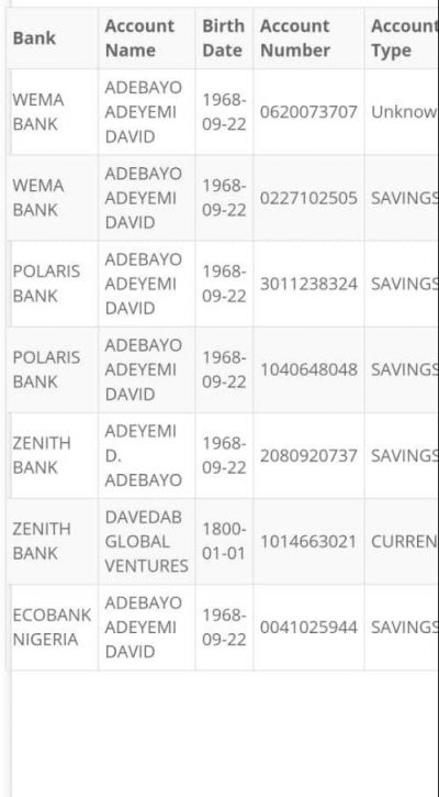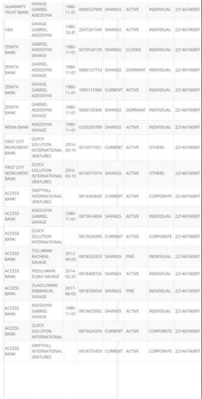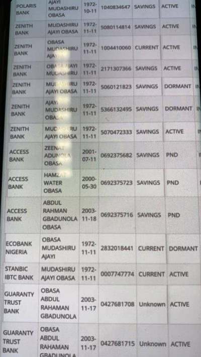 The accounts registered with various names, are being used to siphon public funds in Lagos. The BVN reveals that Obasa operates accounts with multiple names in Polaris Bank, Zenith Bank, Access Bank, Ecobank Nigeria, Stanbic IBTC Bank, Guaranty Trust Bank, United Bank for Africa, First City Monument Bank and Wema Bank.