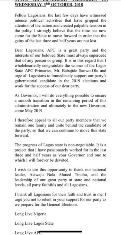 Lagos State Governor, Akinwunmi Ambode has given up on his pursuit of a second term ticket, by conceding defeat to rival Babajide Sanwo-Olu In a conce