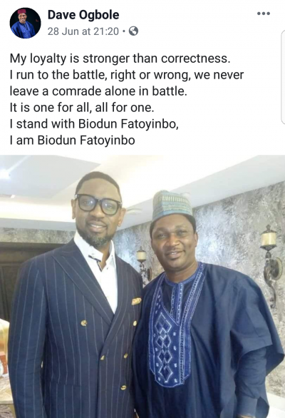 Dave Ogbole said, “My loyalty is stronger than correctness. I run to the battle, right or wrong, we never leave a comrade alone in battle. It is one for all, all for one. I stand with Biodun Fatoyinbo, I am Biodun Fatoyinbo,” he wrote.