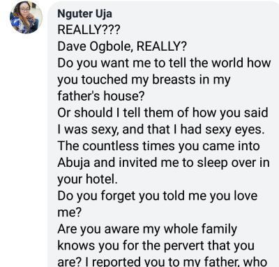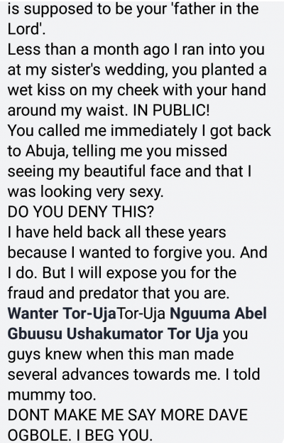 Unfortunately, in the comment section of his post, a lady, Nguter Uja, daughter of Rev Tor Uja,  the Executive Secretary of Nigerian Christian Pilgrims Commission (NCPC), didn’t hesitate to accuse him of sexual misconduct.