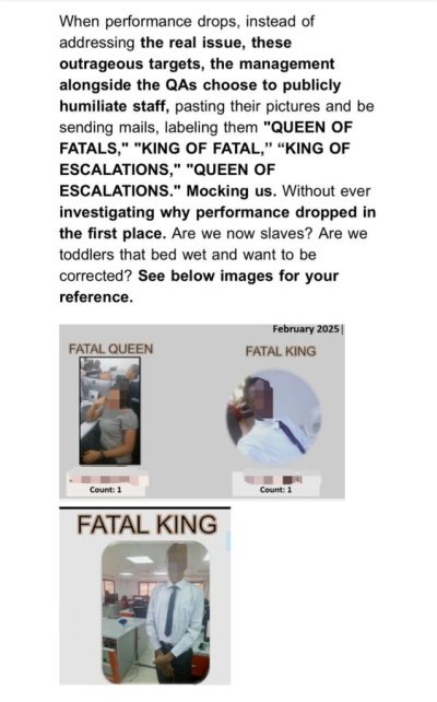 In another separate email sent on Friday, the staff said when their performances drop, the management humiliates them by pasting their pictures and sending them emails branding them ‘Fatal King’, ‘Fatal Queen’, ‘King/Queen of escalations and other derogatory names. They also accused Onyeka and Akaeme of seizing their phones and locking them away in an entire weekend.