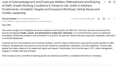 On March 28, the staff collectively sent an email titled Lack of acknowledgement and employee welfare, maltreatment and bullying of staff, unsafe working conditions & threat to life, unfair & arbitrary punishments, unrealistic targets and excessive workload, verbal abuse, and hostile leadership, using a moniker, ‘Flourish Adeleke’ to Tony Elumelu, the bank’s chairman, where they detailed the harrowing and vile things they go through in a work space that is supposed to be conducive.