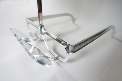 The glasses are made from one sheet of mirrored acrylic that has been bent carefully into the exact angles needed to reflect off the smaller mirror in front of the wearer’s eyes. This smaller mirror is positioned pointing upwards at 45 degrees towards the larger mirror, which looks outwards.