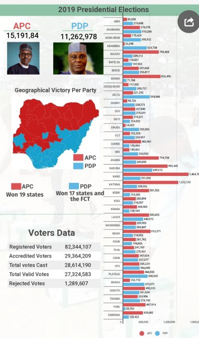 His main challenger Alhaji Atiku Abubakar of the Peoples Democratic Party scored 11, 262,978 votes and won 17 states and Abuja.