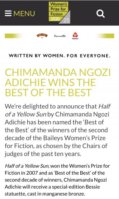 In 2015, The Baileys Women’s Prize for Fiction, asked judges of the past 10 years to pick their best of the best winner from the last decade and Half of a Yellow Sun, was named the best winner of the women’s prize for fiction of the last decade.