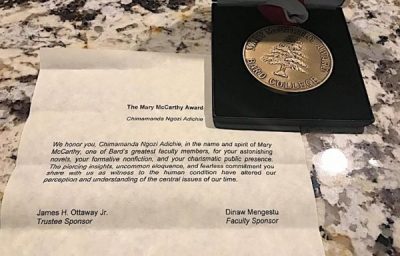 In 2017, she became the first Nigerian to be awarded the Mary McCarthy Prize for her thought-provoking novels and charismatic public presence.