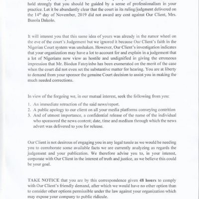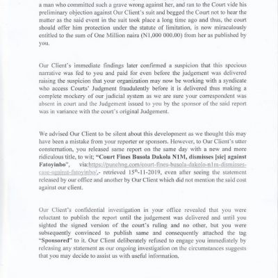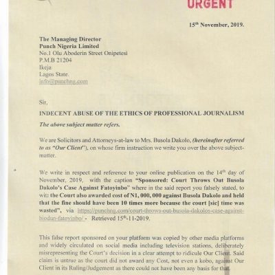 Here below is a letter written by Busola Dakolo’s lawyers asking Punch Newspaper to retract the false story.