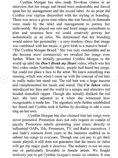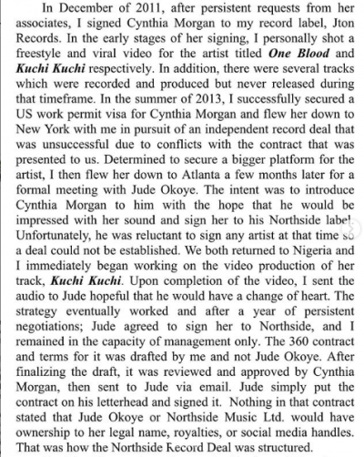The dancehall singer’s former manager revealed that she tried to get the singer signed to Jude Okoye’s Northside Music Group twice, but only succeeded on the second attempt. She also revealed that she drafted the contract Cynthia Morgan signed and not Jude Okoye.