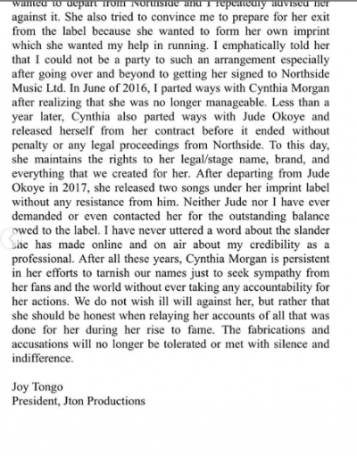 Joy Tongo, Cynthia Morgan's former manager has released an official statement on some incidents she said happened, prior to parting ways with the danc
