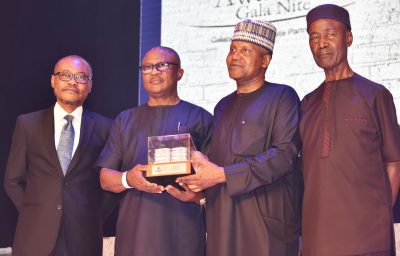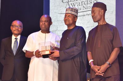 Group Managing Director, Dangote Industries Limited, Olakunle Alake; 1st runner up National Distributor of Dangote Cement, Onyemelukwe Ifenchor, MD, Lafenax Nig. Ltd, receiving an award from President/CE, Dangote Industries Limited, Aliko Dangote; and Group Managing Director, Dangote Cement Plc, Engr. Joseph Makoju at the Dangote Cement Plc 2018 Distributors Award Night, in Lagos on Monday, March 4, 2019