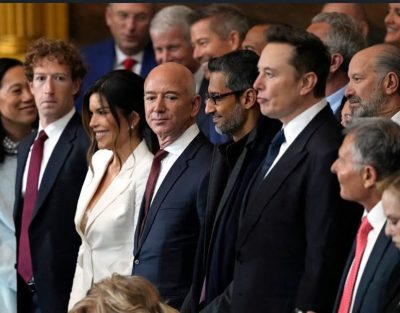 The world’s richest man, Elon Musk, Meta boss Mark Zuckerberg, Amazon chief Jeff Bezos and Google CEO Sundar Pichai all had prime seats in the Capitol alongside Trump’s family and cabinet members.
