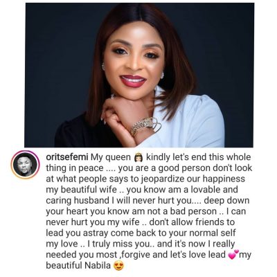 Singer, Oritsefemi's pleas to his wife, Nabila Fash who moved out of their matrimonial home over infidelity and domestic violence, to return home, see