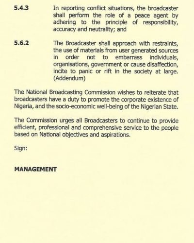 “In specific terms, the commission enjoined broadcasters to take definite note of the following provisions of the Nigeria Broadcasting Code to further guide their broadcast during this challenging time,” the statement read.