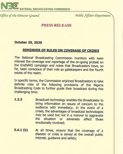 The NBC said it has been monitoring the coverage and reportage of the #EndSARS protests and commended media houses for being conscious of their role as gatekeepers and the fourth estate of the realm.