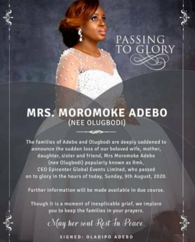 Nigeria’s event management industry has, once again, been through into mourning as yet another leading event planner, Mrs. Moromoke Adebo (nee Olugbodi), passed on in the late hours of Sunday, 9th August, 2020, after a brief illness.