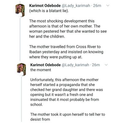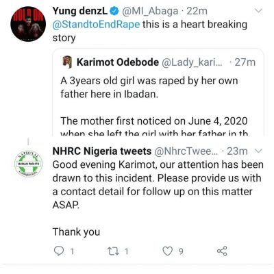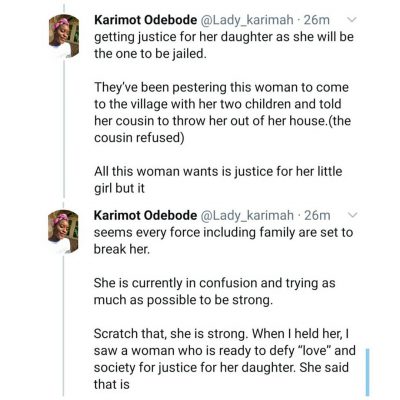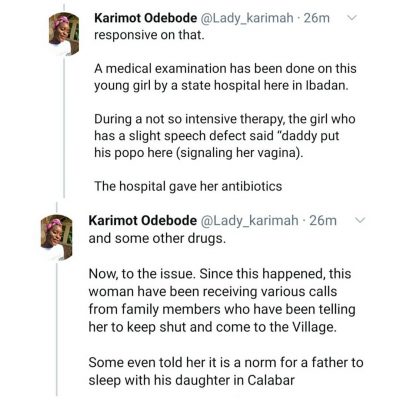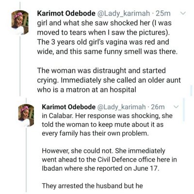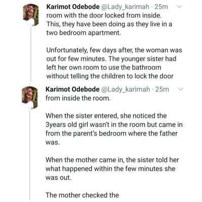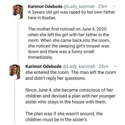 A lady identified as gender rights activist, Karimot Odebode has taken to twitter to narrate the story of how a father raped his 3-year-old daughter i