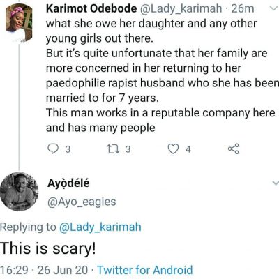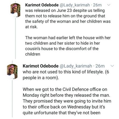The husband was arrested by NSCDC officials but was later released. Karimot says the victim’s mother is currently being threatened.