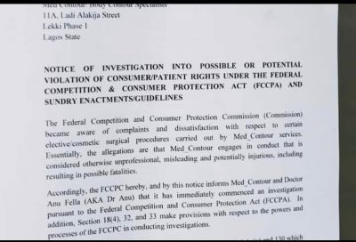 “Accordingly, the FCCPC hereby, and by this notice informs Med Contour that it has immediately commenced an investigation pursuant to the Federal Competition and Consumer Protection Act (FCCPA). Section 18(4), 32, and 33 make provisions with respect to the powers and processes of the FCCPC in conducting investigations. The scope of the investigation is pursuant to sections 17(s), (t), (x), (y) and 130 which prohibit obnoxious practices, require services to be safe and for the Commission to act to reduce risk of injury to consumers, as well as ensure services comply with applicable standards of care.