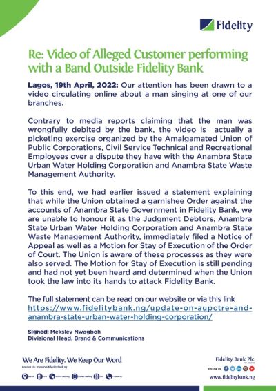 Fidelity Bank Plc has reacted to a viral video of a man who organised a music band outside the premises of one of its branches in Anambra State for being wrongfully debited by the bank.
