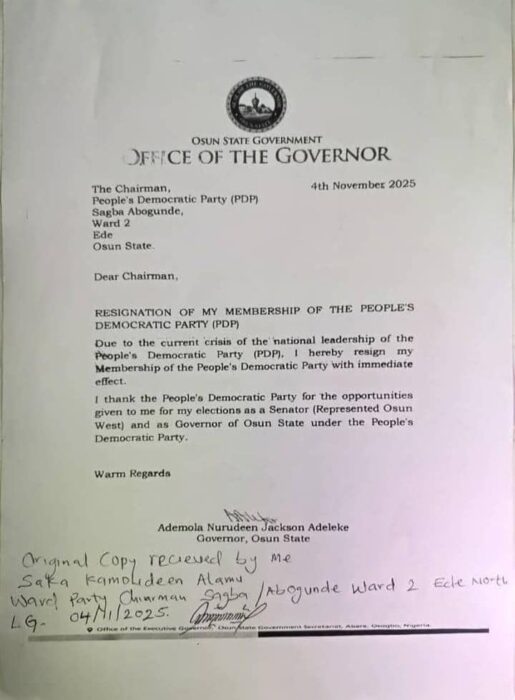 Adeleke’s resignation letter was addressed to the PDP Chairman for Ward 2, Sagba Abogunde of Ede North Local government, Osun State.