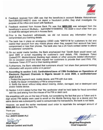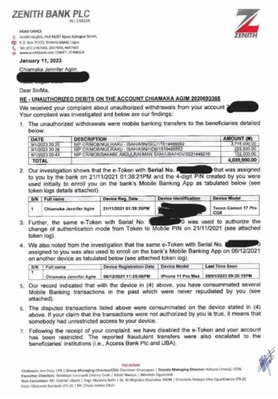 However, Zenith Bank swung into action to investigate how the money was moved from her account to other accounts. The Bank in response to her explained in a two-page investigative report sent to Agim Chiamaka on how her details was compromised to fraudsters using the same device she has used to carry out mobile banking transactions in the past which was never repudiated by the complainant.