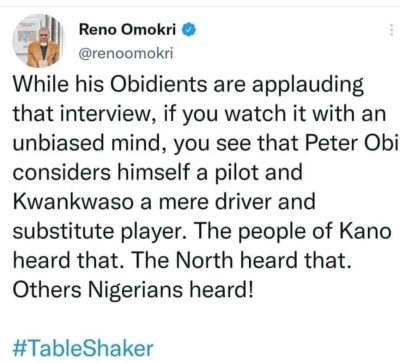 After the interview, Reno commented that Obi considered himself a pilot and Kwankwanso a mere driver and said that the people of Kano and the North have heard his comment.