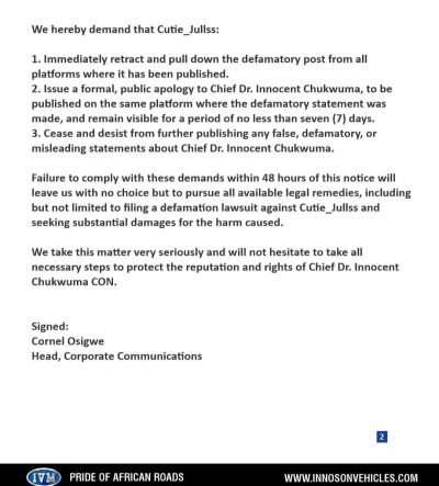 “The aforementioned statement is entirely untrue, fabricated, and lacks any factual basis. It has caused significant harm to Chief Innocent Chukwuma’s personal and professional reputation, as well as caused undue distress.
