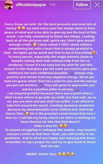 Payne took to her Instagram story on Wednesday to address single mothers and express her wish for them in the spirit of Yuletide. But, while she urged moms to remain resilient in their journey irrespective of the challenges, Payne said that she had raised Zion without any help from her ex-husband.