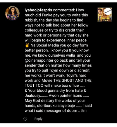 Ojo leading the pack stormed the page to leave a long comment where she not only expressed her disappointment but  also fingered Akindele-Bello of sponsoring the negative review of the movie.