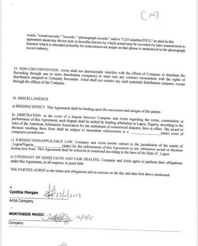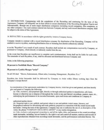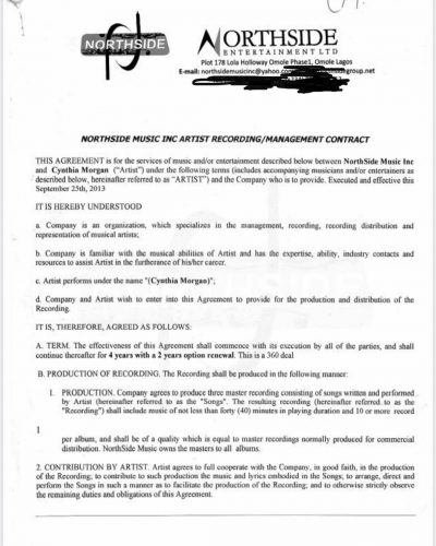 The contract between Cynthia Morgan and Northside Entertainment owned by Jude Okoye which generated a buzz last weekend after the dancehall singer cla
