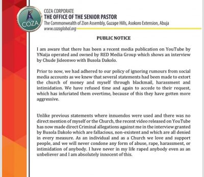 The senior pastor of Common Wealth of Zion Assembly, COZA, Biodun Fatoyinbo, has finally responded to Busola Dakolo’s allegations that he raped her as a minor.  Biodun Fatoyinbo denied the rape allegations in a statement he released this evening saying he has never raped anyone before. He accused Timi Dakolo and his wife, Busola of trying to extort him.
