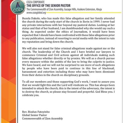 The senior pastor of Common Wealth of Zion Assembly, COZA, Biodun Fatoyinbo, has finally responded to Busola Dakolo’s allegations that he raped her as