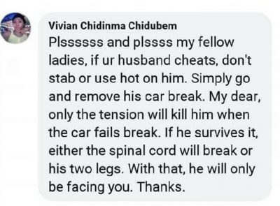 The evil of supporting husbands slaughtering has claimed its first victim as a lady, Vivian Chidinma Chidubem has been kicked out by her newly married husband over the comment she made in “Extraordinary Mums & Singles” a Facebook group in which she expressed support for the slaughtering of husband and even added that instead of using knife they should remove the “break” of their husband’s car so that he be involved in fatal accident and die or sustain a mortal injury.