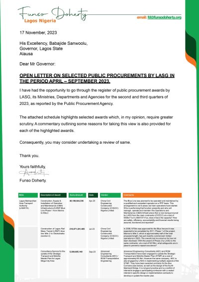In an open letter addressed to Sanwo-Olu, Doherty said he analysed the register of public procurement awards by the Lagos government for the second and third quarters of 2023.