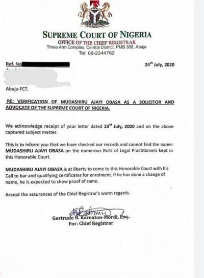 But in a response to an enquiry on the matter on July 24, 2020, the Supreme Court categorically stated that Obasa’s name was not found on the numerous rolls of legal practitioners kept with it. The letter signed by one Gertrude B. Karenton-Mordi on behalf of the Chief Registrar of the Supreme Court said, “This is to inform you that we have checked our records and cannot find the name: MUDASHIRU AJAYI OBASA on the nemerous Rolls of Legal Practitioners kept in this honourable court.