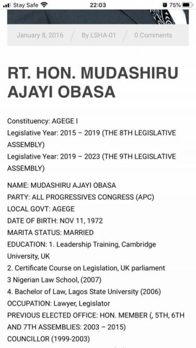 According to SaharaReporters, Obasa’s profile on Wikipedia and the Lagos Assembly’s website describes him as a lawyer and solicitor of the Federal Republic of Nigeria even though there is no mention of where he practiced or a case he handled. He is also described on the Assembly’s website as graduating from the Nigerian Law School in 2007, a year after he obtained a Bachelor of Law degree from the Lagos State University.