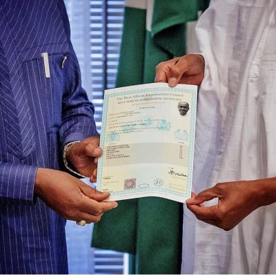 After hiring 13 SANs and blaming the military for the loss of his certificate, WAEC presents it to President Buhari. The West African Examination Coun