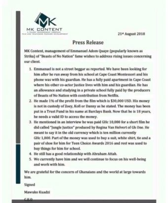 However, Talent Management Company, MK Content has countered the claim of Emmanuel Nii Adom Quaye, saying that his money is safe in a trust fund. The company released a statement providing details on the welfare facilities and financial support given to him following the movie. The company says he ran away from school and his guardian’s home prior to the interview. The company said that together with another child actor from the movie, Justice whom he lives with, they are both on full scholarship paid for by the producers of the movie with contribution from Netflix. The company says his $30,000 is in a Trust Fund in his name at Barclay’s Bank and now that he’s 18, he’ll need a valid ID card to access it. The company added that he’s now back in their custody.