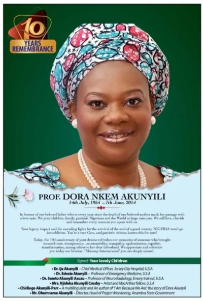 Speaking on Akunyili’s 10th memorial, Obumneme, director, head of project monitoring, Anambra state government, said while time has numbed the pain, the vacuum of her mother’s demise still exists.