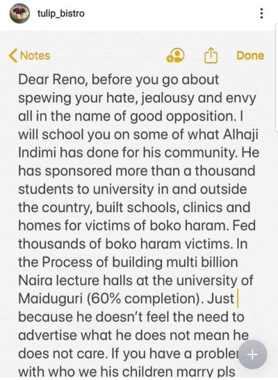 Expectedly, Reno Omokri responded. “Dear Indimi Family, I saw your post attacking me. You shouldn’t see my criticism of your obscene display of wealth in the midst of the extreme poverty surrounding you as hate, neither should you see my opposition to your powerful in law, General Buhari, as bitterness,” he began.