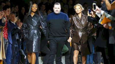 These two images are perhaps the most enduring shots of fashion’s most powerful best friend duo, Kate Moss and Naomi Campell. The first, with Kate Moss in a sheer slip dress, was their first experience of being surrounded by paparazzi, at an Elite Model Agency party in 1993 at the Hilton hotel in London. They appeared together on the runway for the first time in years for designer Kim Jones during his final Louis Vuitton menswear show in 2018.