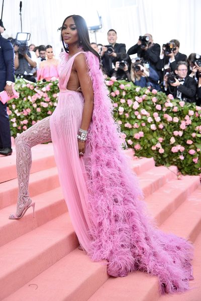 Campbell wore a pastel lilac Valentino Couture gown and a feather cape to the Met Gala in 2019, accessorised with an anonymous man, dressed in all black, whose job was to fan the supermodel as she posed for pictures.