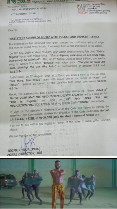 The National Broadcasting Commission, NBC, has banned musician, Falz’s song, ‘This is Nigeria.’ This was disclosed in a letter from the NBC dated 6th August 2018 and signed by its Zonal Director, Igomu Onoja. According to NBC, a part of the song, “This is Nigeria; look how we living now everybody be criminal” has been tagged “vulgar” and the song is now declared “unfit for radio”. Also banned from being aired by NBC, was singer, Wande Cole’s song: ‘Iskaba’ alongside Olamide’s ‘See Mary, See Jesus’.