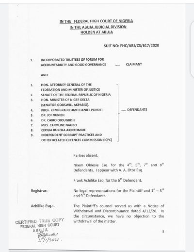 A judgement delivered by Justice A.R. Mohammed struck out the lawsuit against the IMC by the Incorporated Trustees of Forum for Accountability and Good Governance on January 13, 2021. The court refuted reports that it sacked the Pondei-led IMC.