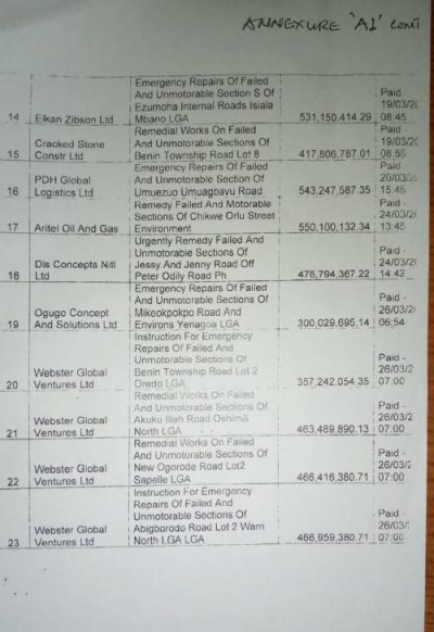 The contracts include instruction of emergency repairs of failed and unmotorable sections of Benin Township Road Lot 2 Oredo LGA for N357m; remedial works of failed and unmotorable sections of Akuku Illah Road Oshimili North LGA for N463m; remedial works of failed and unmotorable sections of New Ogorode Road Lot2 Sapele LGA for N466m and instruction for emergency repairs of failed and unmotorable sections of Abigborodo Road Lots 2 Warri North LGA for N466m.