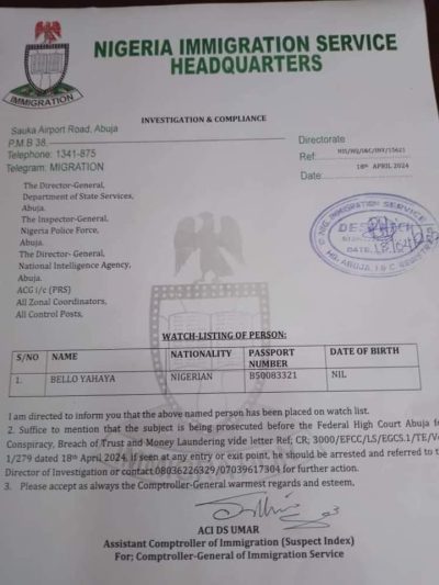 The Nigerian Immigration Service, NIS has placed former Governor of Kogi State, Yahaya Bello, on its watchlist.